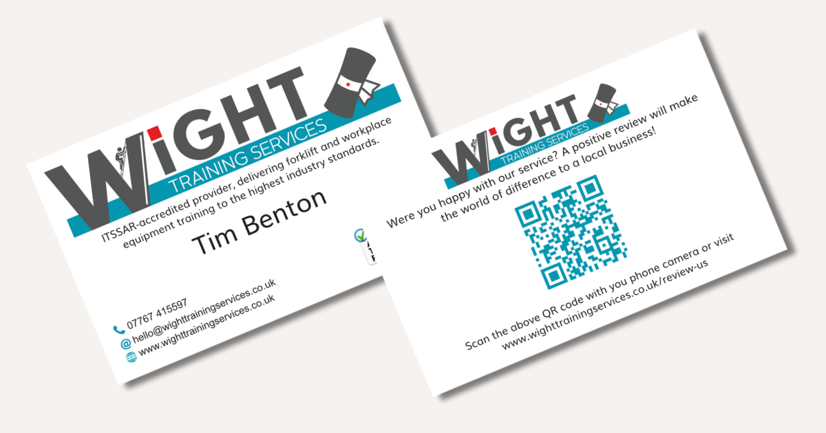 For some of our clients, we’ve designed review cards (either business card style or square cards 148mm x 148mm) featuring a QR code on one side and an offer or sign-up link on the back. Small details like this can make a big difference.